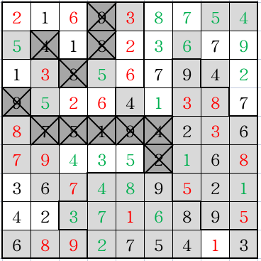 不难猜测整个矩阵需要是一个拉丁方,每个划分出的区域内的 14 个数字可以看作麻将牌,需要和牌。